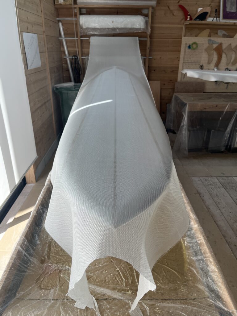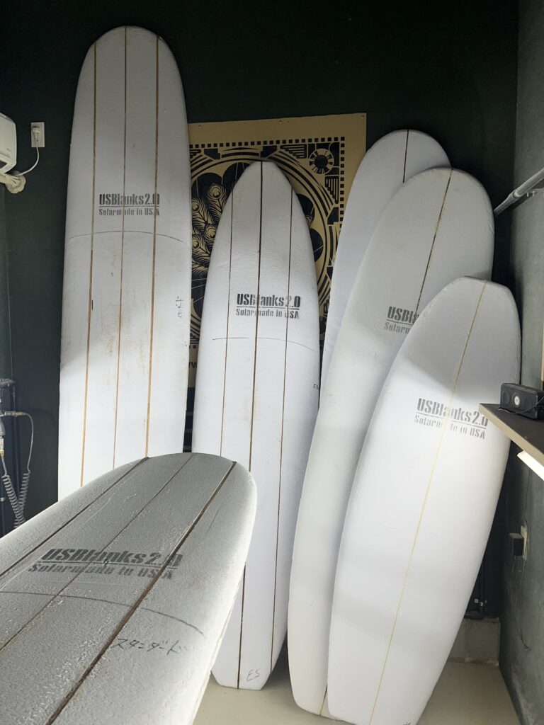 最新のサーフボードは「より白くよりクリアーに」というのが主流なので「シラン処理」されたガラスクロスを使っているファクトリーがほとんどですが、僕のファクトリーではイメージに合わせて使い分けるようにしています。