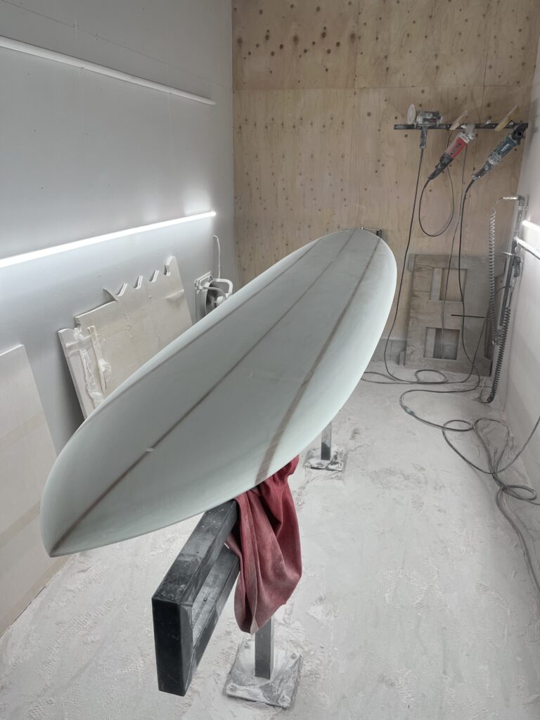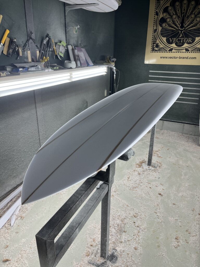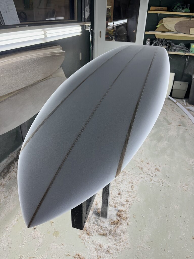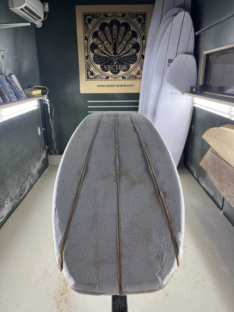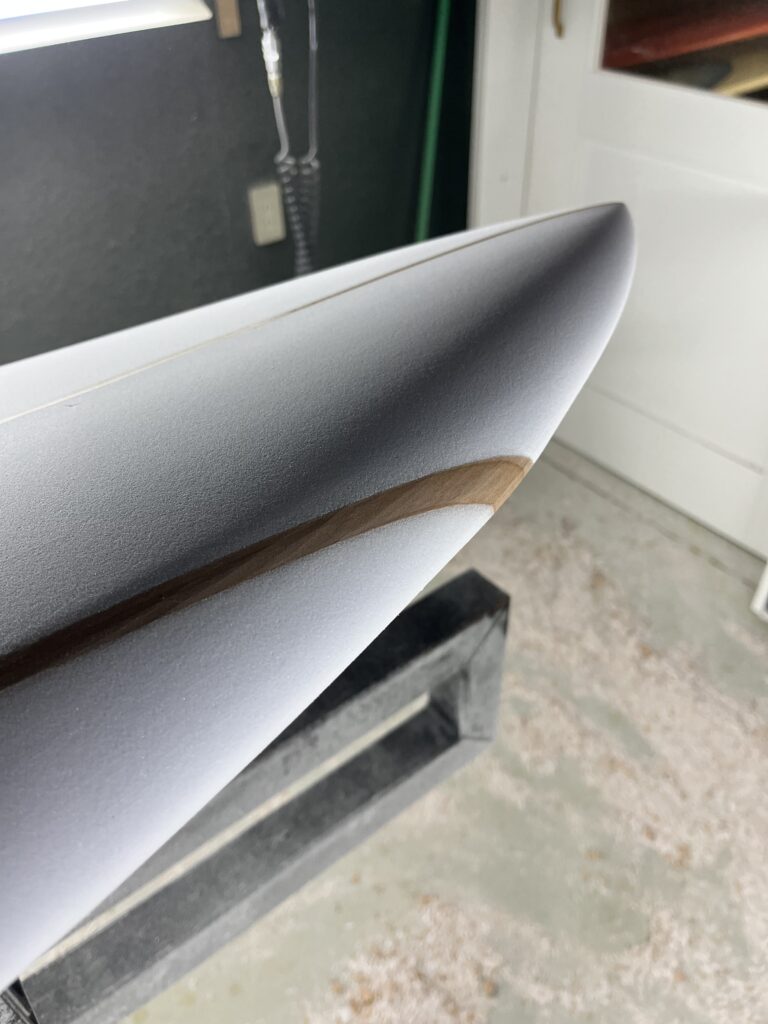 個人的にトリプルストリンガーの好きなところが、このレールの部分。柔らかいフォームと硬いウッドを綺麗な曲線になるようシェイプする。腕の見せどころ。指先に集中し、ミリ単位でアウトラインを追い込んでいくこの時間は、シェイパーとして最も贅沢な時間でもあります。